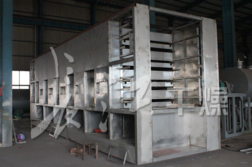干燥機工作時.冷空氣通過熱交換器進行加熱,采用科學合理的循環方式,使熱空氣穿流通過床面上的被干燥物料進行均勻的熱質交換,機體各單元內熱氣流在循環風機的作用下進行熱風循環,^后排出低溫高濕度的空氣,平穩高效地完成整個干燥過程