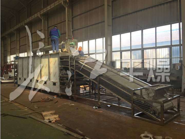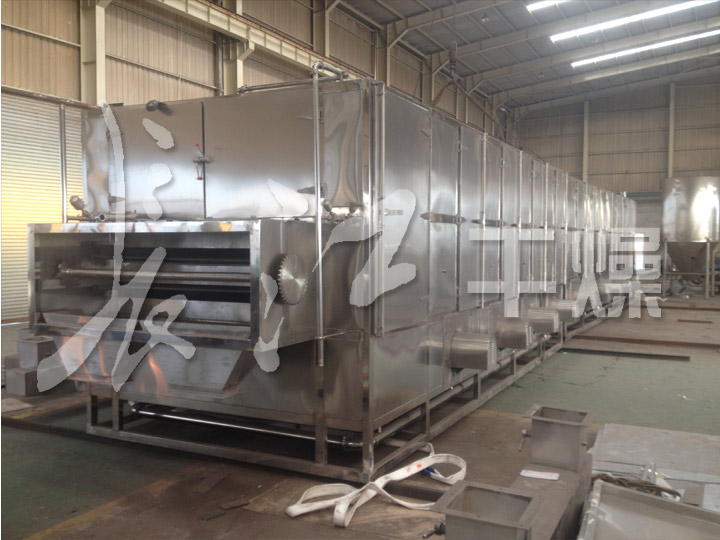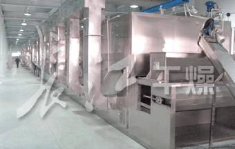 米飯專用帶式干燥機是我公司針對蒸煮后的米飯、浸泡后的糙米、大米等米制品研制出的專用干燥器。潮濕物料經由特制的鋪料機,將其均勻的攤鋪在勻速運行的不銹鋼網帶上(網帶采用平衡折邊網,SUS304不銹鋼材質制作,符合食品級要求,使用壽命長),承重網帶在變頻調速電機的拖動下向前勻速移動,進入干燥室。干燥室由若干單元組成,每個單元熱風獨立循環、溫度自由調節,濕空氣由專門排濕風機排出(排濕量由調節控制),空氣在循環風機導向下經換熱器加熱后,由上往下穿過分風板,與物料完成熱量與質量傳遞的進程,帶走物料中的水分。干燥室內安裝若干翻動裝置,使所有物料均勻與熱風接觸,提高物料干燥效果的均勻性。干燥后的成品連續落入收料器中。