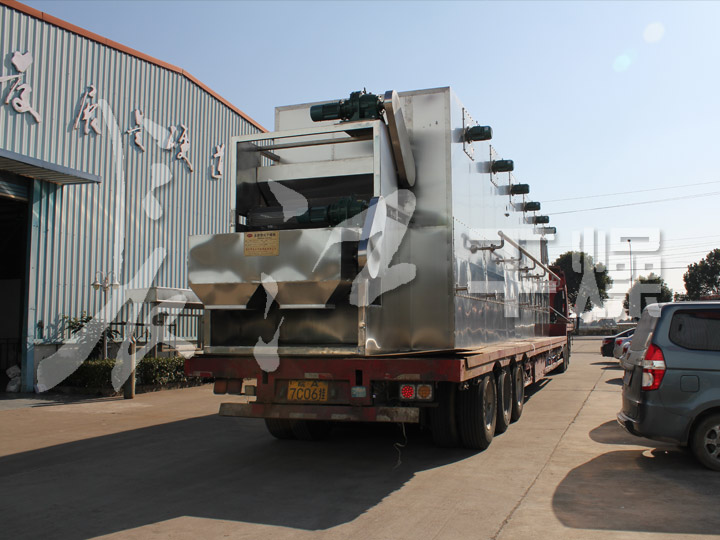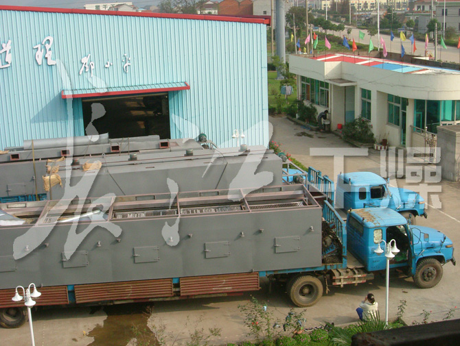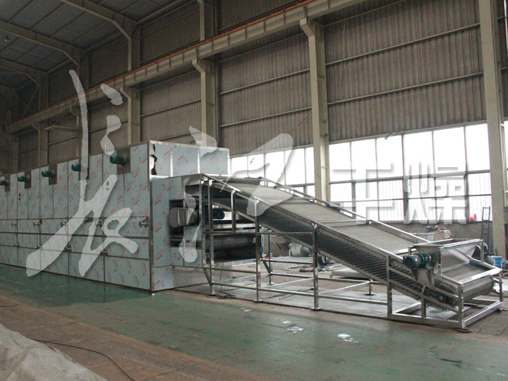 2、用于脫水蔬菜,一般使用三套設備串聯使用,形成初干段、中間段及終干段。在初干段中,由于物料含水量高,透氣性差,故采用小的鋪料厚度,較快的運行速度及較高的干燥溫度。對物料溫度不允許超過60℃的料,初干段中,干燥氣體溫度可高達120℃以下,終干段內物料 停留時間是初干段的3-6倍,鋪料厚度是初干段的2-4倍。對于物料溫度不超過60℃的要求,可采用80℃左右的干燥氣體。采用多段組合能更好的發揮帶式干燥機的性能,且干燥更均勻。